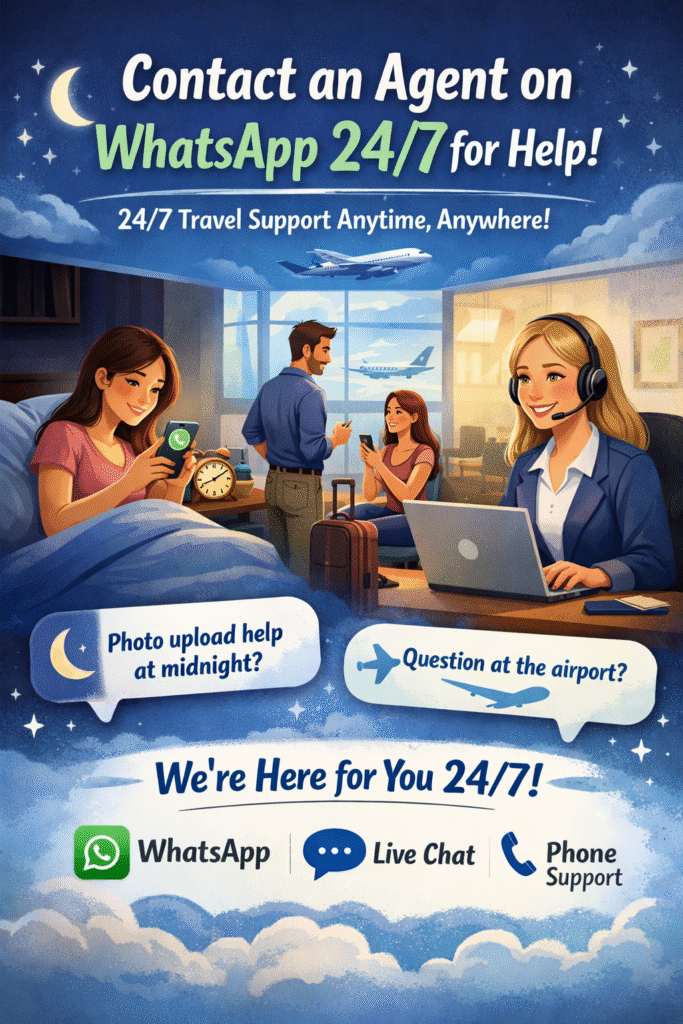 Yes! We understand that travel questions don’t just happen during business hours. We offer 24/7 support via WhatsApp, Live Chat, and Phone. Whether you have a question about your photo upload at midnight or a query at the airport, our professional agents are ready to assist you.